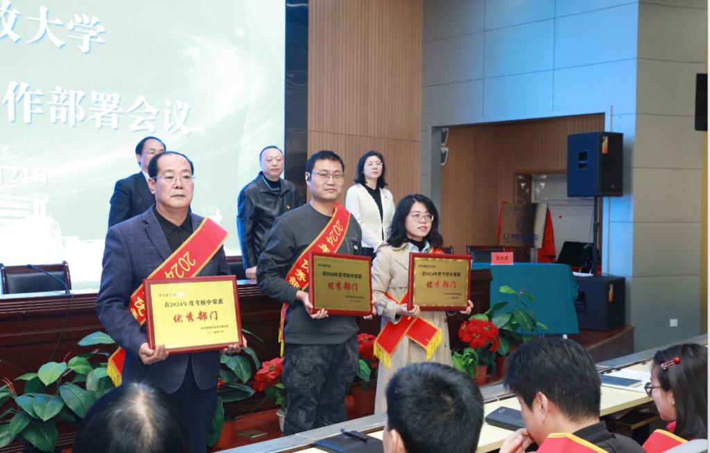 会议表彰了2024年考核优秀部门及个人。分管校领导与各部门签订了2025年度工作目标、安全稳定、校内治安保卫和消防安全工作责任书。