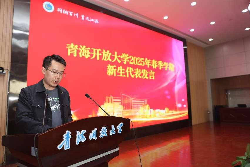 国家开放大学学士学位获得者多杰本,学校奖学金获得者贾佳、2025年春季学期新生曹得鑫、白庆飞4名同学作代表发言,发言中毕业生深情感恩母校培养,分享开放教育带来的成长与收获,新生满怀憧憬,展现求知热情与追梦决心。马克思主义学院脱芸老师作为教师代表从端正学习态度、科学规划学业、践行终身学习方面为新生提出努力方向和学习建议。