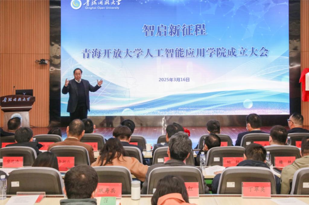 在全球人工智能技术快速发展的背景下,开放大学作为开放教育创新的先锋,正积极拥抱数字化转型的历史性机遇。近日,青海开放大学人工智能应用学院成立,标志着学校在推进教育数字化战略实施、加快推进开放教育与人工智能深度融合方面迈出了关键一步。来自中国传媒大学、科大讯飞高教研究院、联通数字科技有限公司、北京天云智汇科技有限公司,日本乐企株式会社,赛尔网络科技有限公司青海分公司、中国移动青海分公司、青海大学、青海师范大学、青海民族大学、青海藏医院等20个单位28名专家,在宁校党委班子成员、学校教职工100余人参加了人工智能应用学院成立大会。校党委书记、校长尚玛出席会议并讲话。