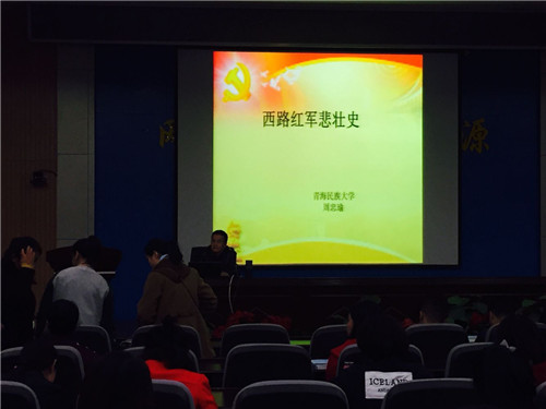 青海民族大学教授、青海省高校思政理论课特聘教授周忠瑜作了“西路军革命史简述 ”的讲座。周教授深刻地分析了西路军在当时历史大背景下的产生、发展和开展的艰苦卓绝的革命斗争,在中国革命战争史上写下的悲壮篇章。他紧密结合西路军在青海的惨痛遭遇,引导学生重温历史,缅怀先烈,不忘初心,继承和发扬革命先烈为国为民,艰苦奋斗的精神,继续前进。
