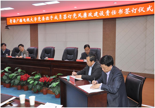4月7日下午,青海广播电视大学党委领导班子成员举行了《2016年党风廉政建设和反腐败工作目标责任书》签字仪式。校党委委员、各党支部书记、各支部纪检委员、学校副处级以上领导干部及全校党员参加了签字仪式。仪式由校党委委员、副校长段宏伟主持。