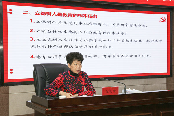 庞晓玲同志围绕党的十八大以来习近平总书记对立德树人作出的一系列重要论述,结合自己的学习和体会,从“立德树人的重大意义、立德树人的重要举措、勇担立德树人的初心使命”三个方面阐述了新时代学校应如何坚持正确的办学方向,如何加强和改进学校思想政治工作。在“立德树人的重大意义”方面,她指出,培养什么人是教育的首要问题,立德树人是教育的根本任务,高校立身之本在于立德树人,立德树人是教育的初心使命。在“立德树人的重要举措”方面,她认为,习近平总书记立足我国社会主义教育实际和国际国内发展大势,从实践层面提出了立德树人的重要举措,即坚持党的全面领导、坚持社会主义办学方向、加强和改进思想政治工作、加强教师队伍建设。在“勇担立德树人的初心使命”方面,她强调,要坚守为党育人、为国育才的初心使命,把立德树人作为学校工作的中心环节,贯穿教育教学全过程。一要加强党的领导,强化政治建设;二要落实课程育人,提升教学质量;三要建强网络阵地,打造特色品牌;四要线上线下发力,增强认同归属;五要培育校风学风,优化育人环境;六要树立开放理念,实现整体联动。