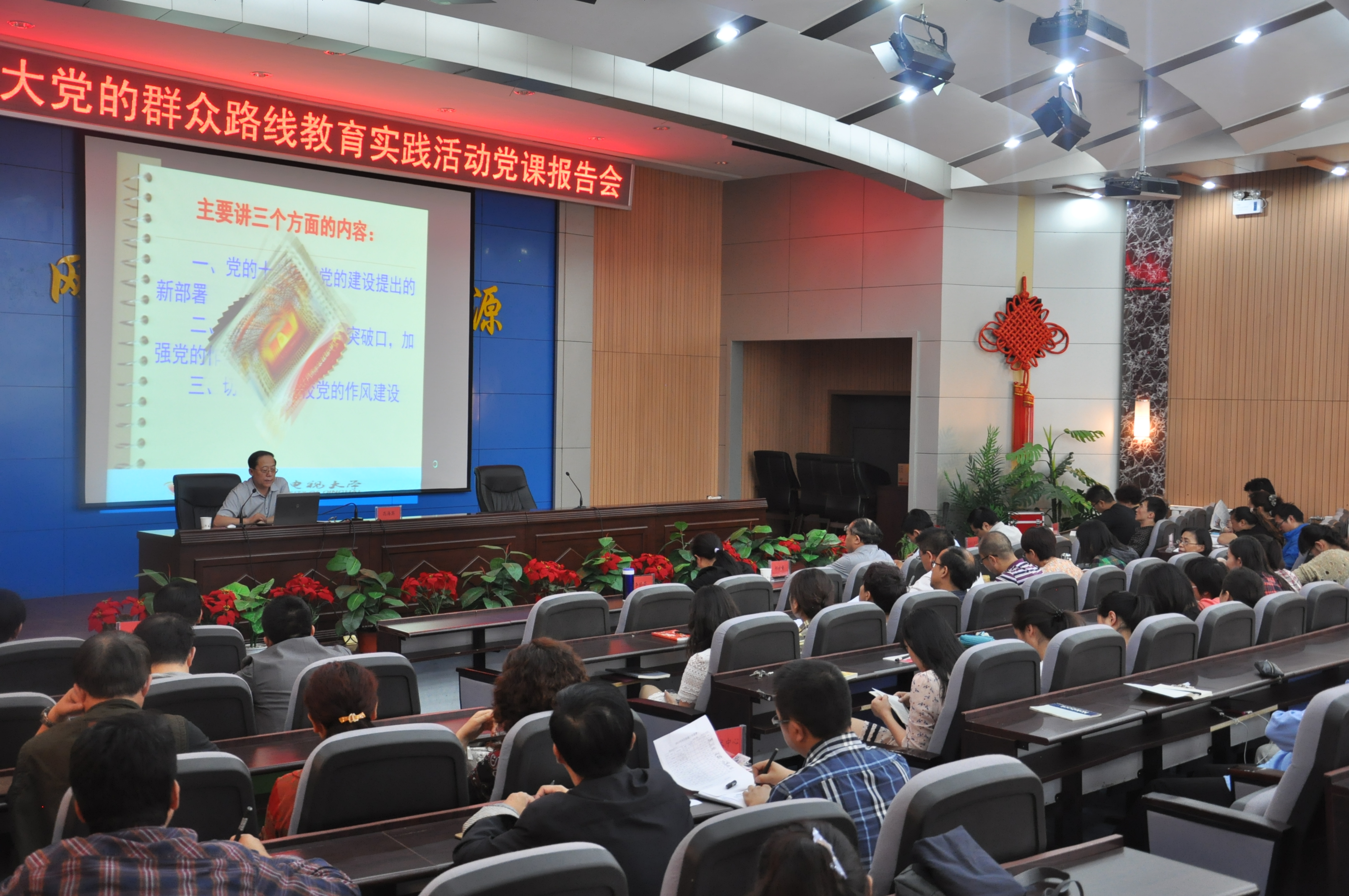 高海宾书记结合当前正在开展的党的群众路线教育实践活动,以加强党的作风建设为主题,讲了三个方面的问题:一是党的十八大对党的建设提出的新部署;二是以反对“四风”为突破口,加强党的作风建设;三是切实加强学校党的作风建设。
