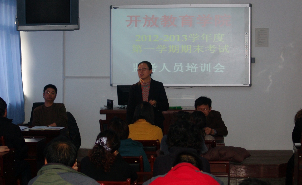 为确保此次考试工作的顺利开展,1月6日下午,开放教育学院招开2012-2013学年度第一学期期末考试监考人员培训会,李丽荣副校长、教务处李洪德副处长,全体监考人员参加了会议,会议由胡华院长主持。