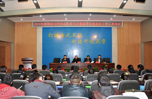 为提高玉树州治多县中小学教师教育教学能力和综合素质,提升灾区灾后内涵建设,2012年5月28日,“玉树州治多县中小学骨干教师信息化培训班”开班仪式在西宁举行。青海广播电视大学承担具体组织实施工作。青海广播电视大学校长祁永寿、海西州支援玉树州治多县灾后恢复重建工程指挥部副指挥长王永录同志出席开班式。青海广播电视大学继续教育学院院长王青宁、教务处副处长王照侠也出席了会议。