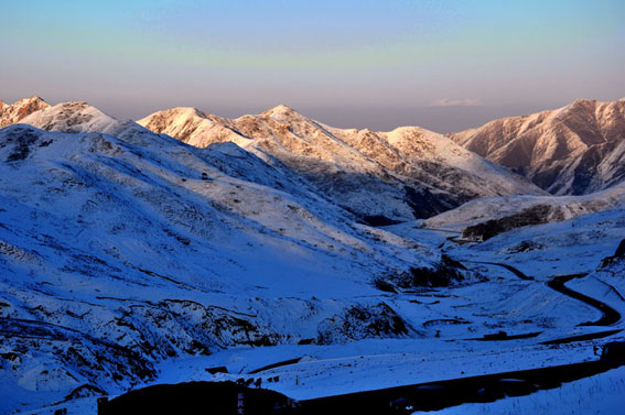 傍晚时分,阳光温暖着皑皑雪峰,路在车前延伸,希望向远方延伸