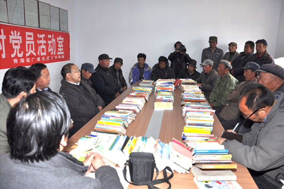 党员活动室里,有的人在拆包装,有的人在整理书,青海广播电视大学鲜红的横幅挂起来了,电大的师傅也忙活起来了,老乡们的脸上露出了喜悦之情,小孩子们也手舞足蹈地跟在大人后边,仿佛也特别开心。