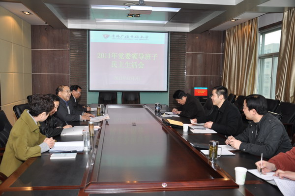 2011年12月9日,青海电大党委召开党委班子民主生活会,省纪委三室常峰昆同志亲临指导民主生活会,学校党委副书记、校长祁永寿、副书记赵志鹏、副校长李宝安、庞晓玲出席会议。学校纪委副书记傅学彬、组织人事处副处长田洪民、办公室主任宋辉列席会议。