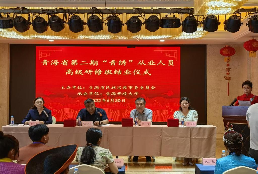 6月30日,由省民宗委主办,青海开放大学承办的青海省第二期“青绣”从业人员高级研修班圆满结束,省民委副主任哈斯巴图、青海开放大学副校长刘青和学校继续教育学院副院长魏青风出席结业仪式。