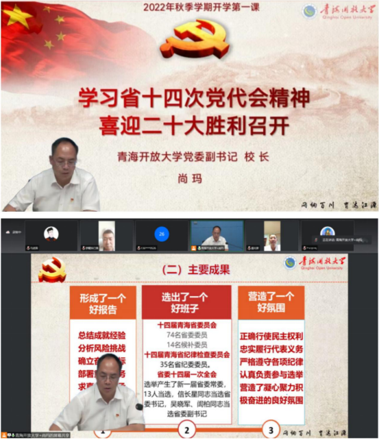 为贯彻落实好省教育厅关于《上好2022年秋季“开学第一课”》和做好《2022年秋季学期学校领导干部和特聘教授讲思政课》的要求,青海开放大学及时部署、精心准备,校长尚玛、副校长刘建红、刘青先后面向全省开大系统师生,开展了“云上开学第一课”,取得良好的思政育人效果。