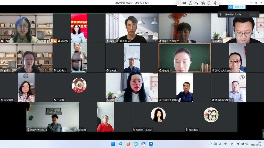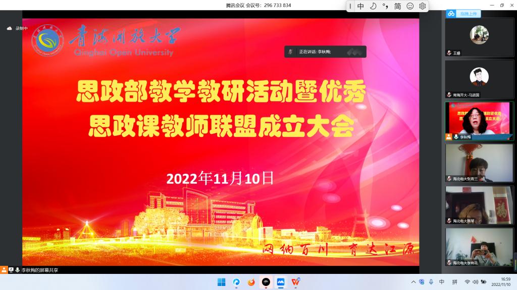 为将党的二十大精神更好地融入思政课教学,11月10日,青海开放大学在线召开思政教学教研活动暨优秀思政课教师联盟成立大会,副校长刘建红、人文学院院长帖征、副院长欧明建、巩寿兵、曾晓红在线参会,甘肃开放大学党曲楠主任,青海开放大学思政部、海北电大、海东电大、海西电大、互助电大、贵德电大、都兰电大22名思政课教师参加会议。青海开放大学思政部李秋梅教授主持会议。