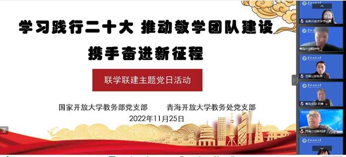 为深入学习贯彻党的二十大精神,学习《中国共产党章程》和习近平总书记“五个牢牢把握”重要要求,深刻领悟团结就是力量的深刻内涵,加强体系联动作用,推动教学团队建设,携手奋进新征程,11月25日下午,国家开放大学教务部党支部和青海开放大学教务处党支部、海西州广播电视大学以视频形式开展了以“学习践行二十大 推动教学团队建设 携手奋进新征程”为主题的联学联建主题党日活动。国家开放大学党委委员、副校长李松,青海开放大学党委委员、副校长刘青以普通党员身份参加了活动,活动由国家开放大学教务部党支部书记古小华主持。两个党支部全体党员和海西州广播电视大学2名党员教师参加活动,青海开放大学教务处特邀2名群众代表参加此次主题党日活动。