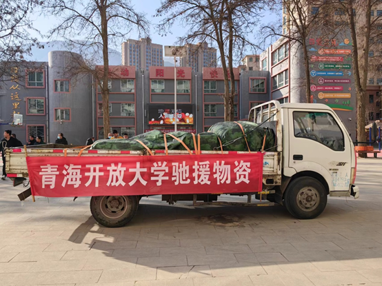 12月23日,装有棉被、床垫、电暖的救援物资车顺利抵达民和电大,受灾学生代表现场领取了救援物资。