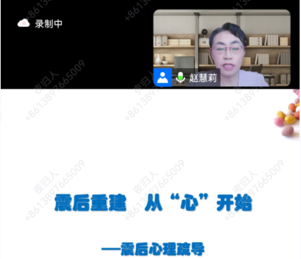 赵慧莉教授从震后容易出现的情绪症状、如何应对与调适、怎么帮助我们的孩子摆脱心理伤害、战胜焦虑与抑郁的方法等方面进行了经验分享。她介绍,通常人们在地震后,因巨大的恐惧陷于无助的情绪之中,大多数会出现心理应激反应,导致烦躁、失眠、抑郁等症状。我们应该接受事实,调整认知,勇于直面,通过寻求社会支持、向人倾诉、帮助他人,从中找到战胜困难的勇气。她建议,面对创伤,不要着急勉强自己去忘记伤痛,要允许自己在短时间内的消沉,让情绪有一个反应的过程,待情绪趋于平稳后,注意饮食作息,保持身体健康的前提和条件允许的情况下,主动参与灾后重建工作。