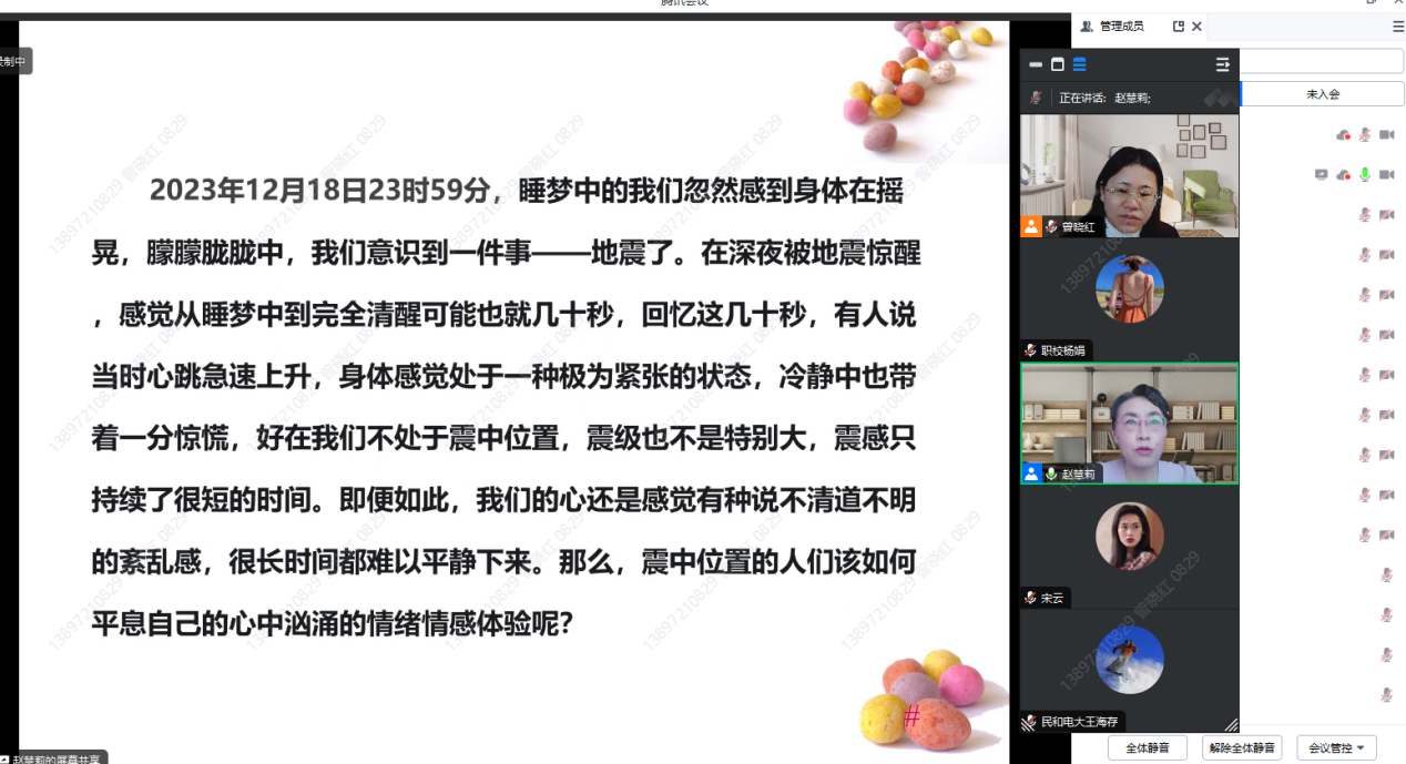 为帮助震区师生重建信心和安全感,尽快走出地震带来的心理阴霾,1月3日上午,青海开放大学邀请青海师范大学心理学教授赵慧莉为震区师生作了主题为《震后重建 从“心”开始》心理辅导讲座。民和电大、循化电大师生及省校相关师生参加了此次线上讲座。