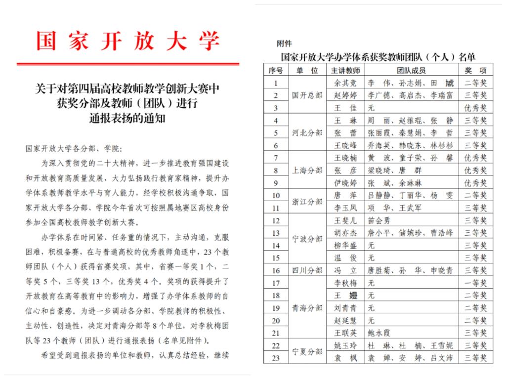 今年,国家开放大学体系首次按照属地赛区高校身份参加第四届全国高校教师教学创新大赛。青海开放大学在时间紧、任务重的情况下,主动沟通、克服困难、积极备赛,在4月21日举办的第四届全国高校教师教学创新大赛青海省赛中,学校5位教师脱颖而出,获得佳绩,基础课程赛道李秋梅老师获正高组一等奖,王嫚副老师获得副高组二等奖,刘青青老师获中级以下组二等奖;课程思政赛道赵延慧老师获二等奖,王联英老师团队获三等奖。学校和5名获奖教师被国家开放大学进行通报表扬。