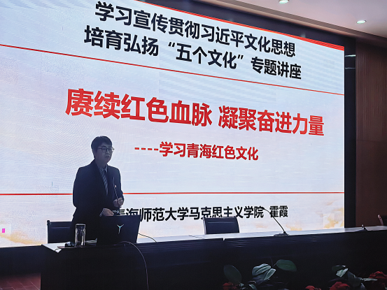 讲座中,霍霞教授讲述了百年来青海红色文化的演进与变迁,通过历史逻辑展现出青海红色文化是充满生命力与传承力的有机文化,明确青海红色文化是以革命文化为内核的文化模式,蕴含着伟大斗争精神和人与自然、人与社会的和谐和合。强调红色资源承载着中国共产党艰苦卓绝的革命史、波澜壮阔的奋斗史、砥砺奋进的改革史,见证着中国共产党人的初心和使命,凝聚着党的优良传统和作风,彰显着党的性质和宗旨,是不可再生的“活化石”。号召师生在新时代要传承与发展青海红色文化的时代价值,赓续红色血脉,凝聚奋进力量,讲好青海红色文化故事、传播青海红色文化声音。
