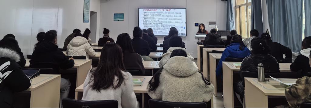为深入学习宣传习近平文化思想,进一步贯彻落实习近平总书记关于加强和改进民族工作的重要思想以及习近平总书记在全国民族团结进步表彰大会上的讲话精神,2024年11月24日上午,根据省委安排,青海省文联李玉英副研究员来校为师生作题为“以习近平文化思想引领青海多元一体民族文化共荣发展”的讲座。马克思主义学院全体教师、2024年秋季学期专科班学生参加讲座。