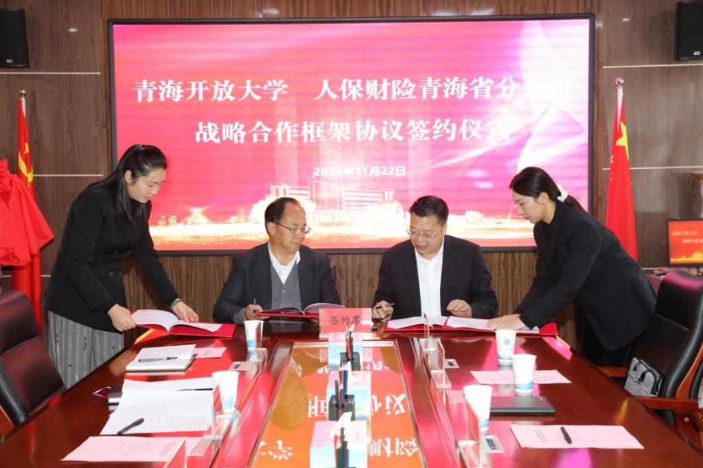 仪式上,尚玛校长与李志恒总经理为“青海开放大学—青海人保联合学院”揭牌,并签署《青海开放大学 人保财险青海省分公司战略合作框架协议》。