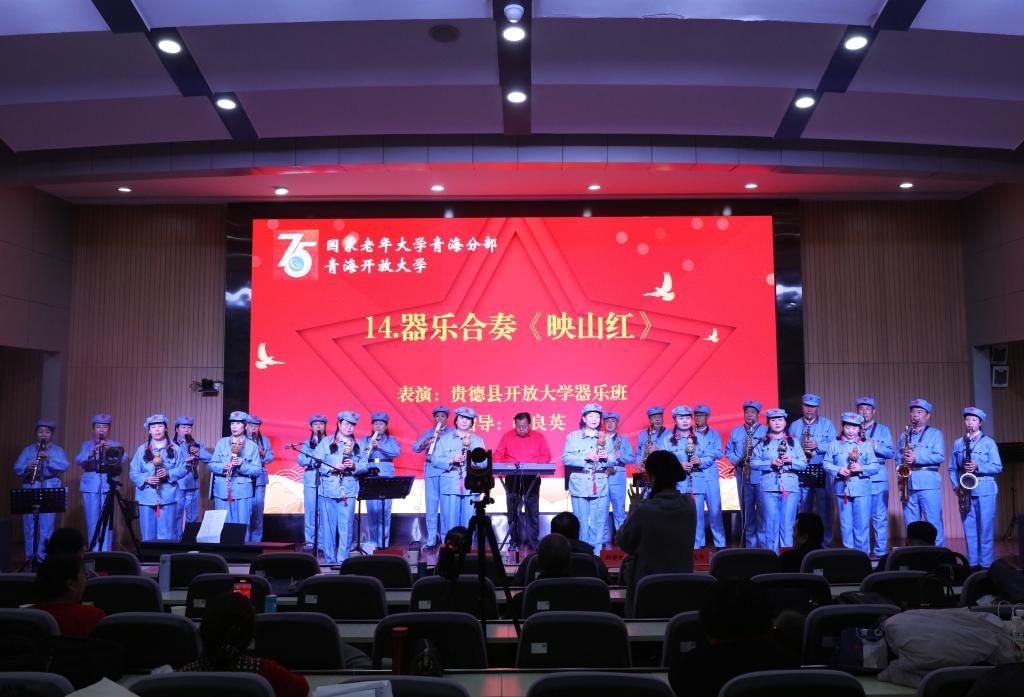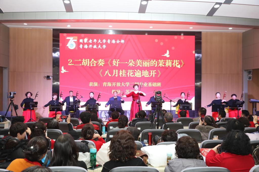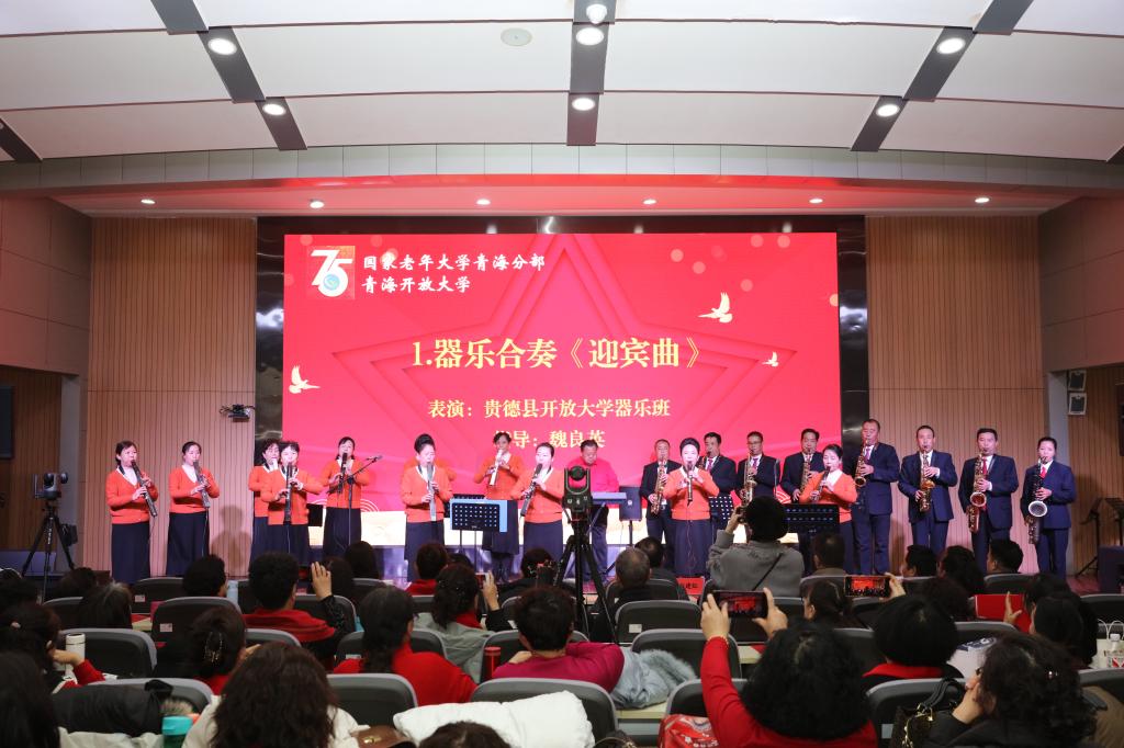 演出在刘建红副校长热情洋溢的致辞中拉开帷幕。开场由贵德县开放大学器乐班带来了一首《迎宾曲》,以悠扬旋律奏响演出序曲,营造出热烈欢快氛围。器乐合奏《映山红》和《花儿香》,以其熟练配合尽显扎实功底,彰显对音乐的执着追求与默契协作。