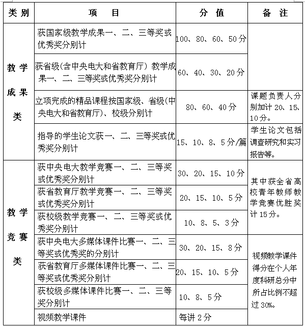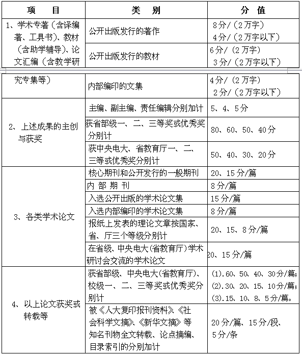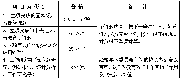 注:一项成果多次使用或获奖,按最高分值计分,不重复计算;与校外人员合作进行的课题研究,由科研管理部门根据具体情况给予相应积分;课题未结题但按计划取得阶段性成果,按完成比例计分,但在结题后计分时不重复计算;未通过结题评审的不予计分。