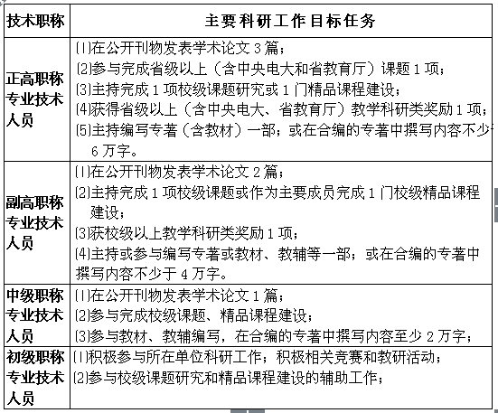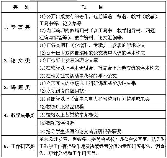 (一)教职工在履行岗位职责的同时,可以通过课题研究、编写专著、撰写论文、参加各类教学竞赛活动、进行工作研究等方式开展科研工作,达到相应专业技术职务的量化指标要求,并在聘期内取得下表所列成果之一: