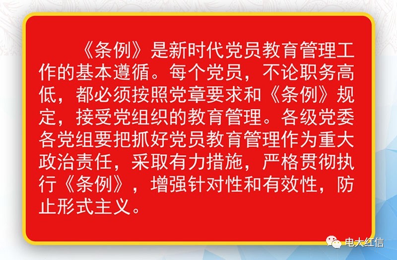 党员教育管理是党的建设基础性经常性工作。党的十八大以来,以习近平同志为核心的党中央高度重视加强党员教育管理工作,推动形成全党从严从实抓党员教育管理的良好态势。