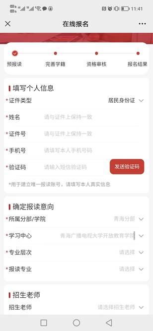 扫描所报学校的专属二维码,进入在线报读平台。填写真实姓名、身份证、手机号,选择分部和学习中心、选择专业层次和报读专业,点击“下一步”。