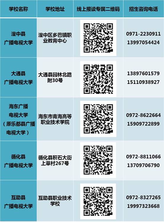 (三)报名地点:青海开放大学报名处设在 “学生服务大厅”(西宁市城西区五四西路7号,学校大门向东30米);州、县报名地点设在当地电大。