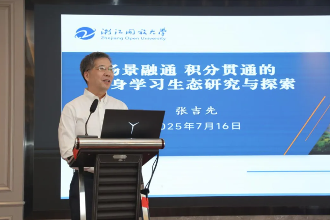 7月16日上午,青海开放大学举办2025年度暑期小学期学术交流活动,浙江开放大学副校长张吉先教授以“场景融通——积分贯通的终身学习生态研究与实践”为题作专题讲座。