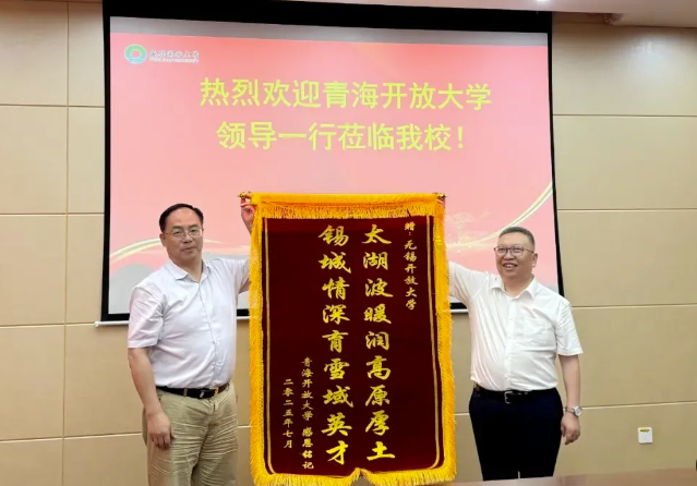 座谈会上,田建军校长对尚玛书记一行的到来表示热烈欢迎,并详细介绍了无锡开放大学的办学基本情况。尚玛书记代表青海开放大学与海东市开放大学,对无锡开放大学长期以来的帮扶表示衷心感谢,希望以此次交流为契机,双方共同谋划“十五五”期间无锡开放大学对口帮扶海东市开放大学的工作,持续深化“山海协作”情谊,开启教育帮扶新篇章。杨磊云副校长围绕无锡开放大学学务导师能力提升实践,作了主题为“压实责任‘加速跑’培训赋能‘再升级’”的专题汇报。双方就“十五五”期间教育帮扶工作展开深入交流与探讨,积极探索更多合作方向与帮扶举措。会上,尚玛书记代表青海开放大学向无锡开放大学赠送锦旗,以表谢意。