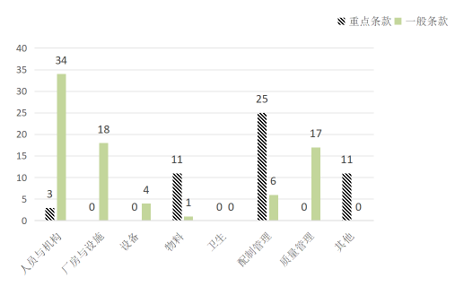 按照人员与机构、房屋与设施、设备、物料、卫生、配制管理、质量管理和其他8个大项对缺陷项目进行汇总归类见图1。按照出现频次,缺陷项目位列前3的分别为人员与机构、配制管理、厂房与设施,各有缺陷项37条、31条、18条,占总缺陷项目的28.46%、23.85%、13.85%;其中,重点条款位列前3的分别为配制管理、物料、其他,各有缺陷项25条、11条、11条,占重点条款总数的50%、22%、22%;一般条款位列前三的分别为人员与机构、房屋与设施、质量管理,各有缺陷项34条、18条、17条,占一般条款总数的42.50%、22.50%、21.25%。